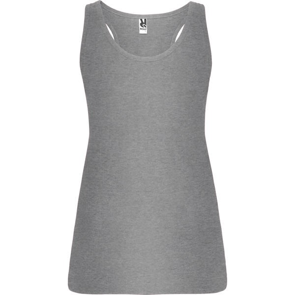 Camiseta entallada, con sisas y escote ribeteado, ancho y enrollado. Espalda estilo nadadora y costuras