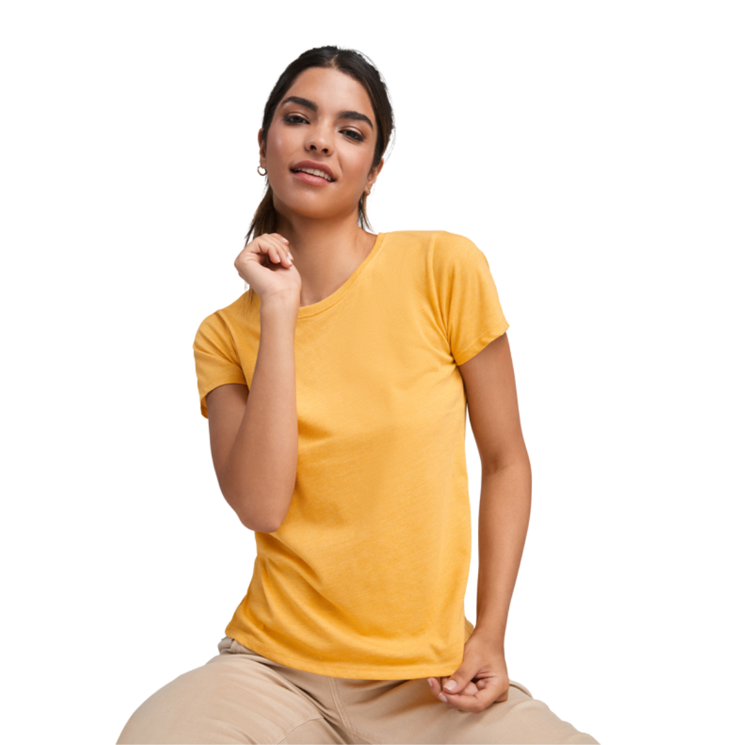 Camiseta manga corta ligeramente entallada con acabado vigoré. Cuello redondo en punto canalé 1×1 con
