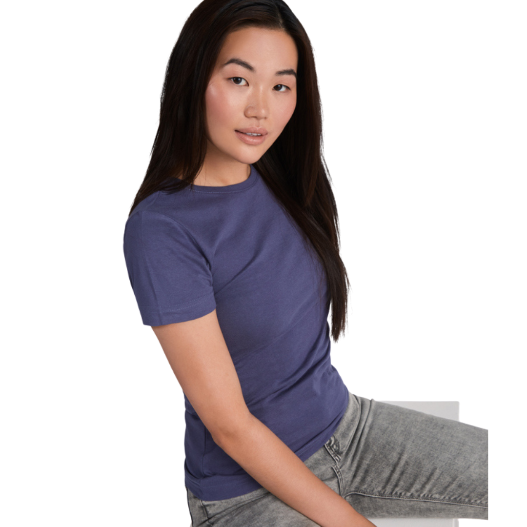 Camiseta de manga corta entallada. Cuello redondo de dos capas en canalé 1×1 con cubre costuras de hombro