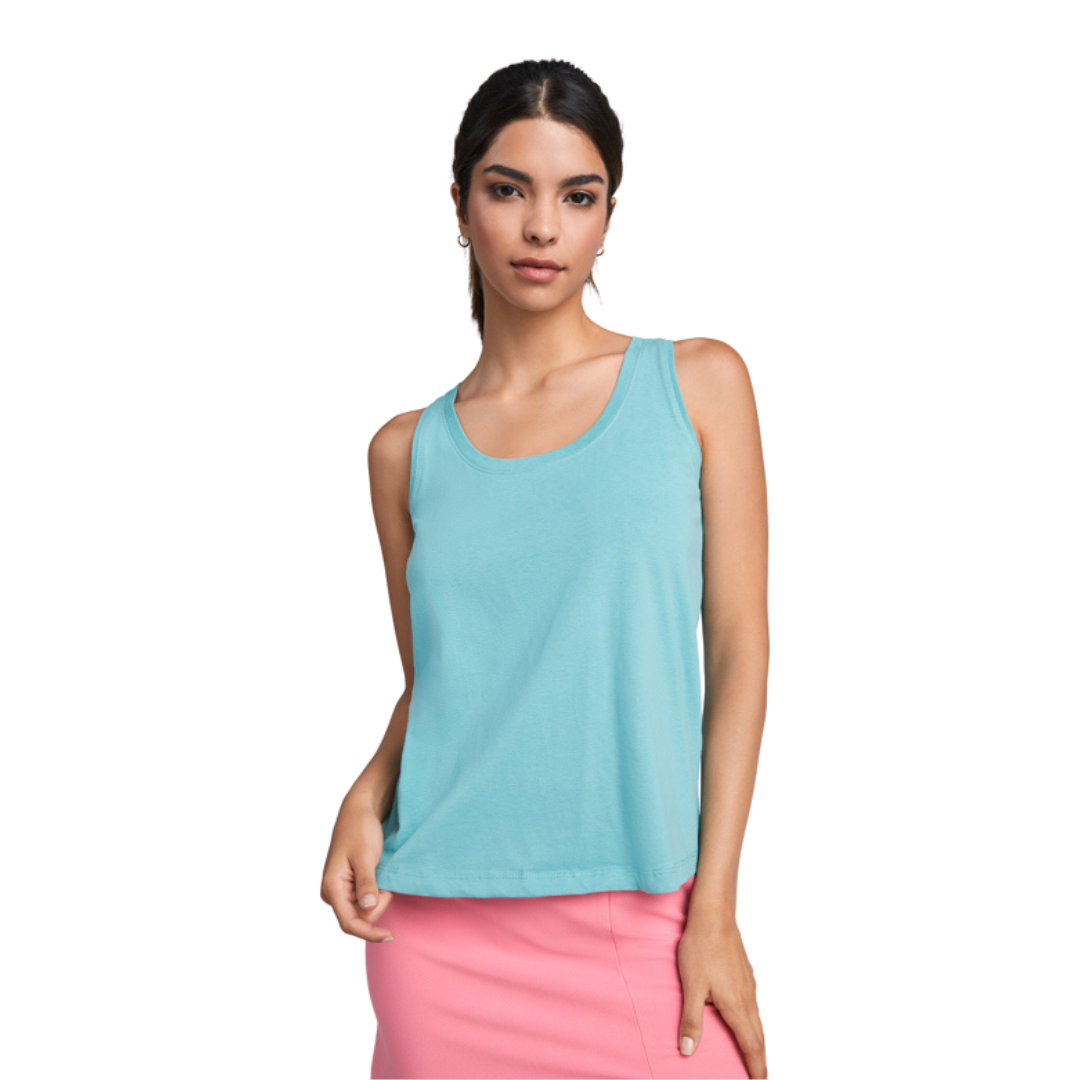 Camiseta amplia de mujer de tirante ancho. Escote y sisas en canalé 1×1. Bajo con forma redondeada.