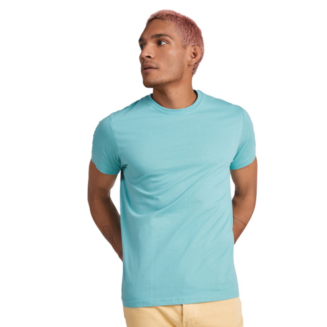 Camiseta tubular de manga corta. Cuello redondo con elastano. Costuras laterales en tallas de niño.